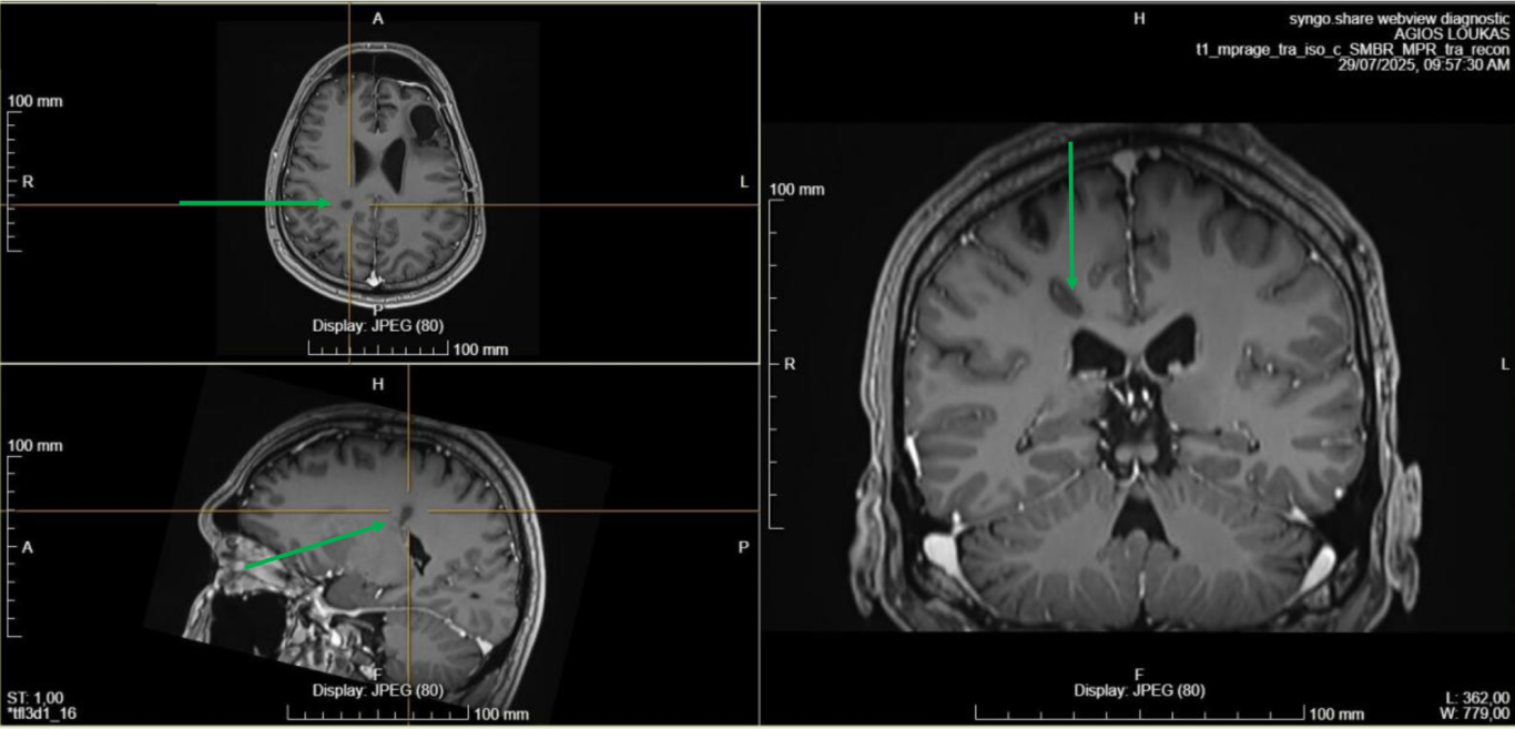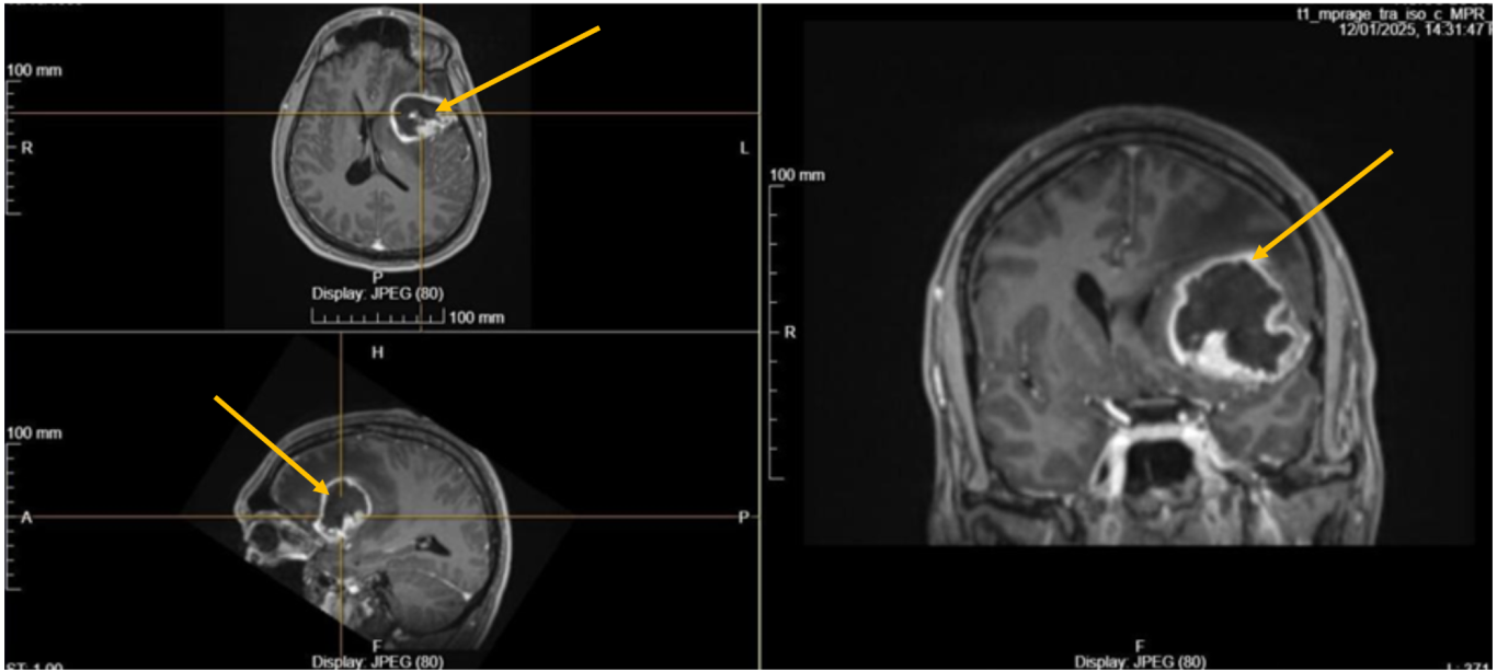 Νεαρός ασθενής (39 ετών) με διάγνωση γλοιοβλαστώματος (1η εικόνα), το οποίο αφαιρέθηκε χειρουργικά.